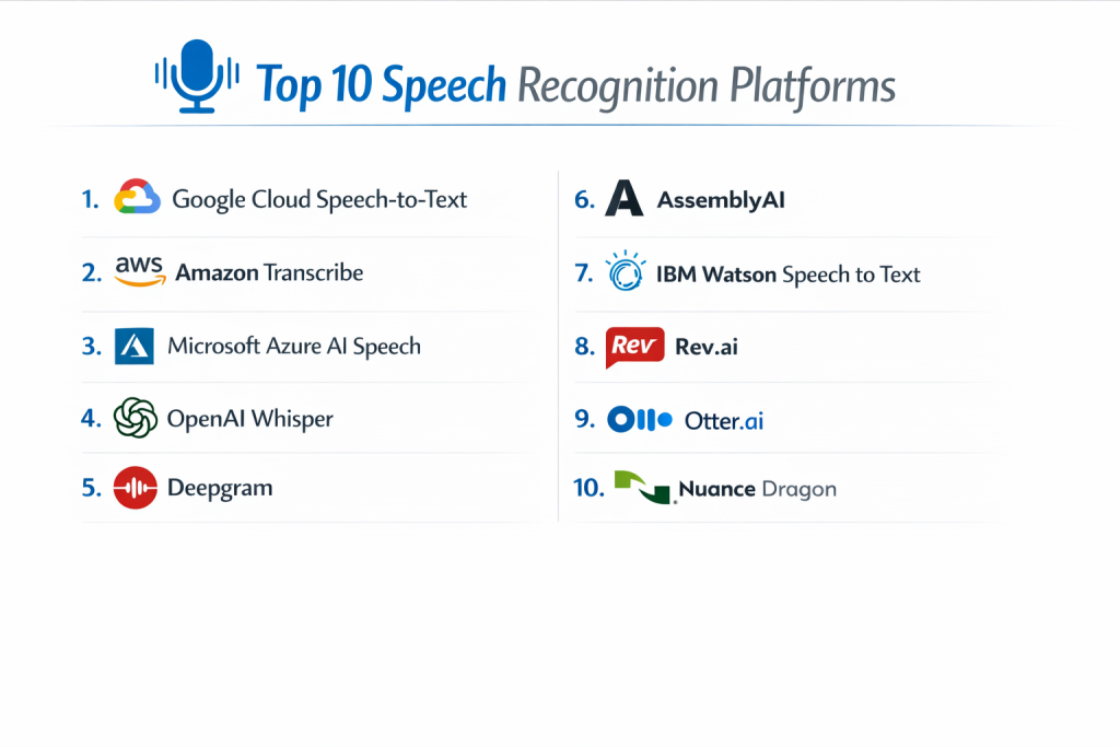 Choosing the right Speech Recognition Platform in 2026 is no longer just about accuracy; it is about integration and intelligence. While OpenAI Whisper and Google Cloud have set a high bar for raw performance, the “best” tool for your organization depends on whether you need a developer-friendly API like AssemblyAI, a productivity-focused tool like Otter.ai, or a highly secure enterprise ecosystem like Microsoft Azure.