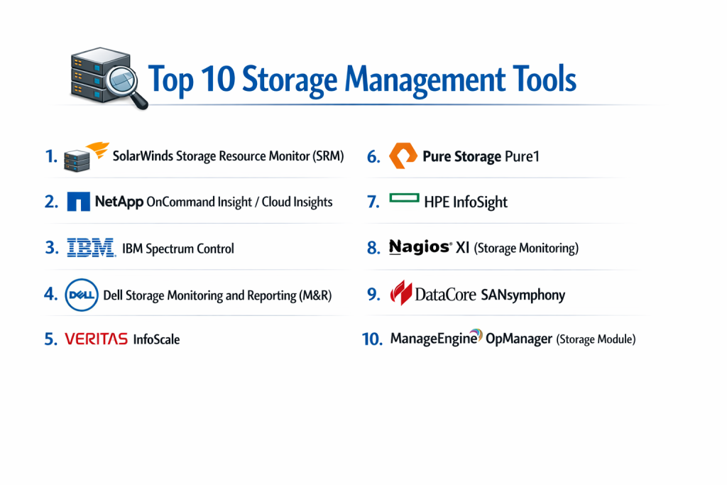 The importance of effective storage management has skyrocketed as global data volumes explode. Without these tools, organizations often suffer from “storage sprawl,” where expensive hardware sits underutilized while other systems face critical shortages. Key real-world use cases include automating the migration of “cold” data to cheaper cloud tiers, identifying performance “hotspots” in a database cluster, and forecasting future capacity needs to prevent emergency hardware purchases. When evaluating tools, users should look for multi-vendor support, real-time analytics, automated policy enforcement, and cloud-native integration capabilities.